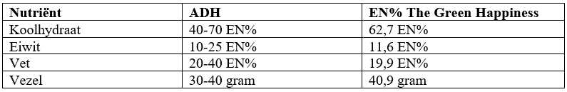 De ADH van eiwitten is 10-25% ("Gezondheidsraad; Voedingsnormen: energie, eiwitten, vetten en verteerbare koolhydraten", 2001). Uit onze berekeningen komt een EN% van 11,6. Wanneer je dit dieet volgt valt je eiwitinname binnen de ADH. Het dieet is veganistisch. Voor veganisten is het belangrijk om op de eiwitinname te letten, omdat een van de grootste eiwitbronnen vlees is. Dierlijke eiwitten loop je nu mis. In plantaardige eiwitten zitten soms minder essentiële aminozuren of in een verkeerde verhouding (Voedingscentrum, Your 50 Days of Green Happiness, sd). Daarnaast is het eiwit uit sommige plantaardige producten soms moeilijker te verteren (Voedingscentrum, Your 50 Days of Green Happiness, sd). Er wordt soms wel de optie gegeven om een stuk vlees, vis of ei te nemen ter vervanging van aardappelen of rijst. Er staat in het boek dat het vrijwel onmogelijk is om bij een calorie-inname die voldoet aan je energiebehoefte een tekort aan eiwitten binnen te krijgen. De calorie-inname in het programma is echter lager dan de energiebehoefte. Er is dus wel een risico op een tekort aan eiwitten.
